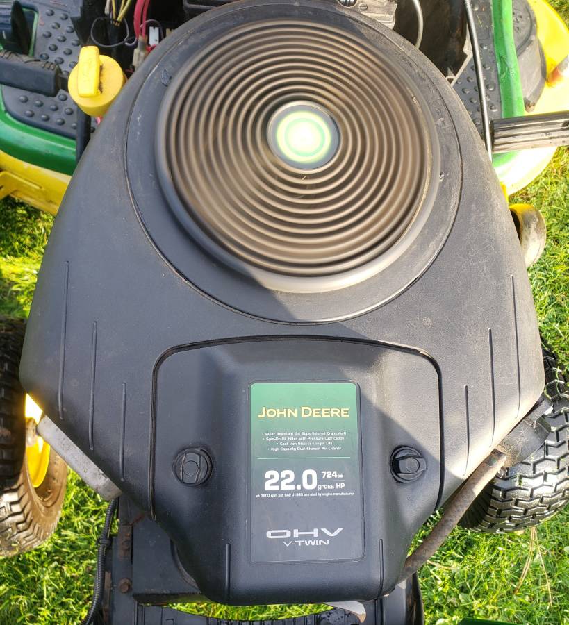 For sale: A used John Deere D140 riding mower with a powerful 22HP V-twin engine. It comes with an automatic hydrostatic transmission and a 48-inch mower deck equipped with triple blades that can even mow in reverse. The mower also includes a bagger system that effectively picks up grass and leaves.
