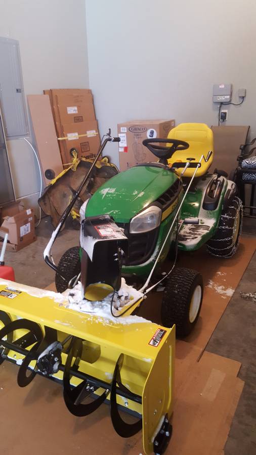 Like new 2019 John Deere E180 Riding Lawn Mower with Snowblower. About 25 hours on the tractor itself. Snowblower attachment is completely new, only used during most active snow storm we’ve had. Comes loaded with tire chains, weights and rear weight brace. This is a 25-horsepower machine with a 54-inch cutting plate. The only reason to sell is because our driveway is too steep, so I’m going to need a four-wheeler blade road.