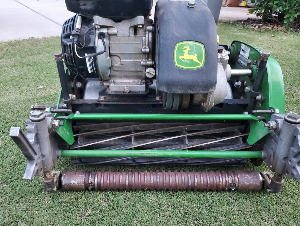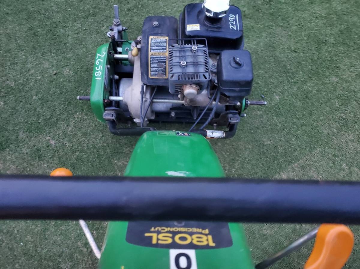 This is a John Deere greensmower/reel mower, model JD-180SL. The Honda engine runs and the reel engages, but the reel-to-bedknife alignment needs adjustment before it’s ready to mow. The reel was sharpened and routine maintenance was done by a golf course mechanic in February 2024. It has seen very little use since then.