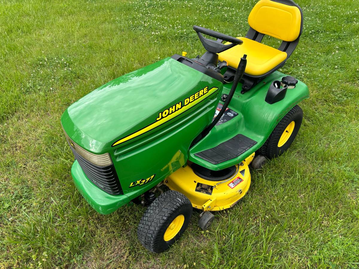 The John Deere LX277 is a mid-size lawn tractor equipped with a 17HP Kawasaki engine. Designed for medium to large lawns, it is available in both two-wheel and all-wheel steering variants. It is known for its durability, ease of use, and maneuverability.