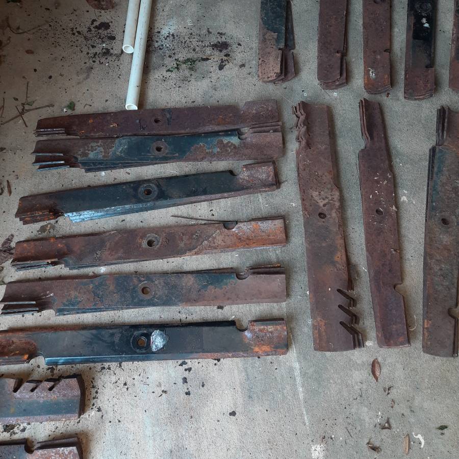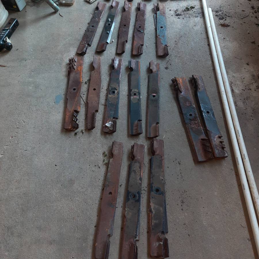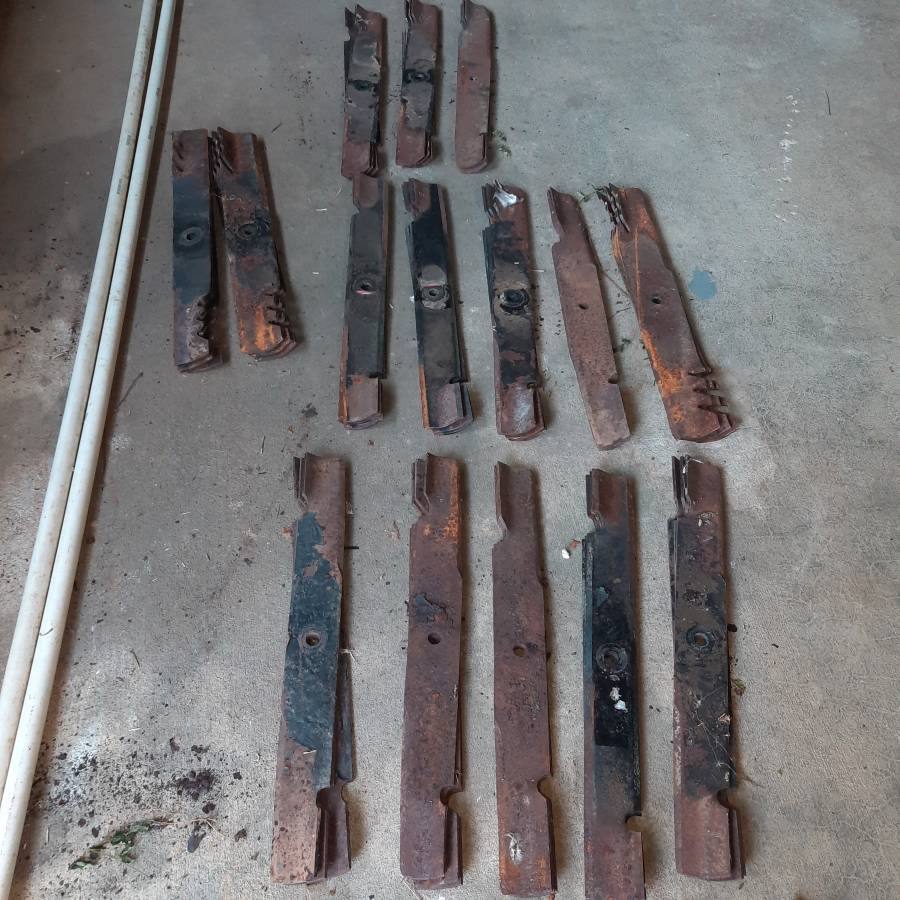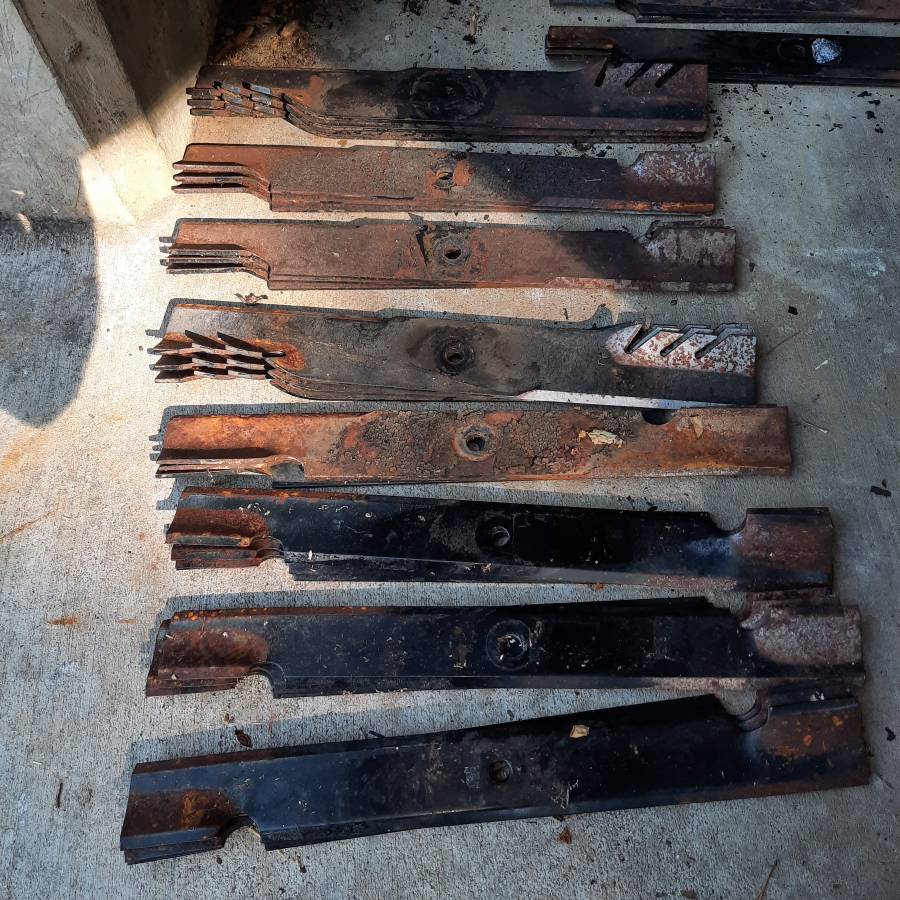 Wide variety of lawn mower blades from a Scag 61″ zero-turn mower.