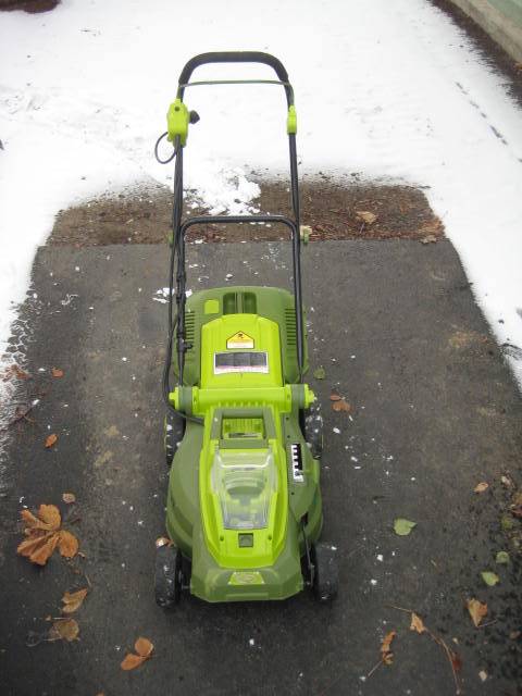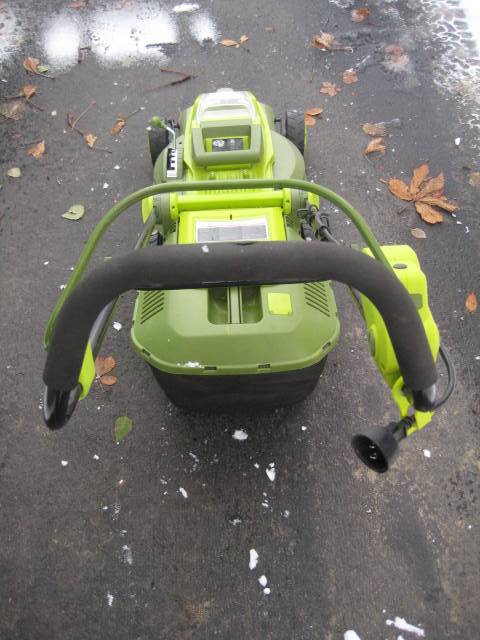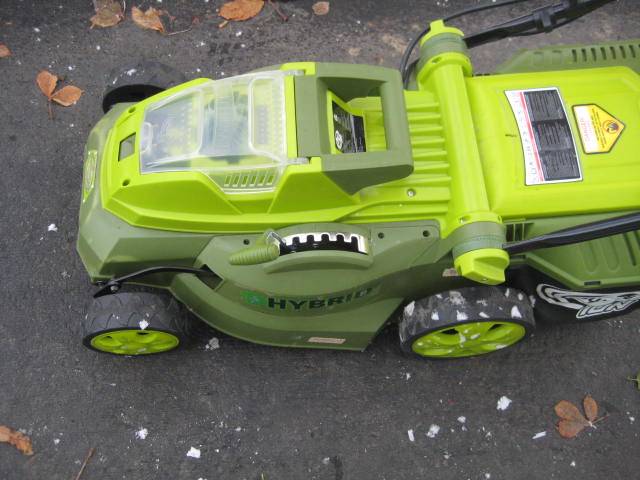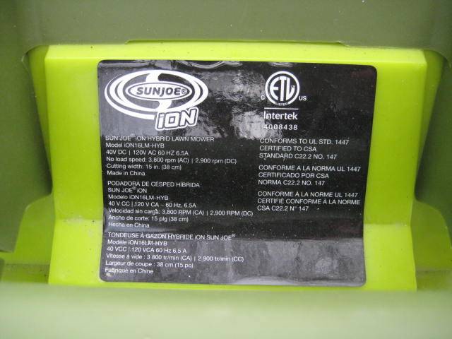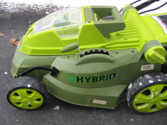 40 volt Hybrid Cordless Electric Lawn Mower from Sun Joe. The 40 volt battery, charger, bag and owner’s manual are included. This is just LIKE NEW! Used just a few times in summer homes. The battery takes the full charge and keeps it. This is the larger 16-inch cutting width 40V mover… not the smaller 28Volt. Model: ion16 LM-HYB If the ad is up then it is available, already assembled, no shipping costs and no tax.