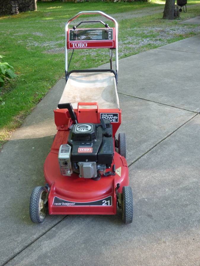 Used Toro 21 inch Self Propelled Lawn Mower for sale. It’s a mulch type mower and it’s equipped with a rear bag collection system. It has a 21 “path of mow or cut. It has a 3-speed choice of speed or gear selection power system. It’s a rear wheel drive type mower. It has a Deluxe Power Drive system. It’s a well-made quality product from the Toro Mower Company. It’s super clean and a very solid mower. The deck is a magnesium alloy so it won’t rust. It has a new mower blade on it. Please see pictures for more details.