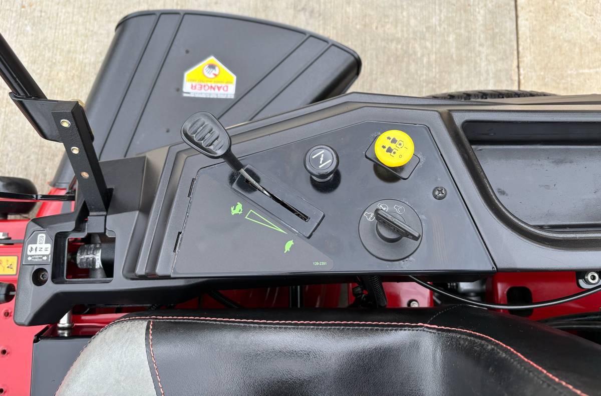 The seat is surprisingly comfortable, even during long sessions. Vibration is minimal, and the ride feels smooth across my acre lot. The three-speed trim/tow/mow control is a nice touch for different tasks.