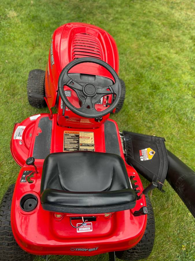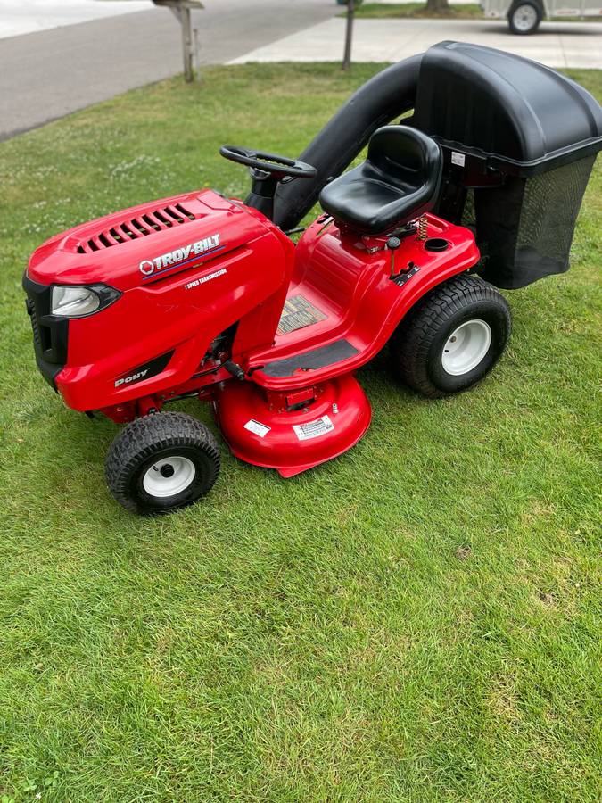 For sale is a reliable Troy-Bilt Pony riding lawn mower. It runs, drives, and cuts as it should. Features include: